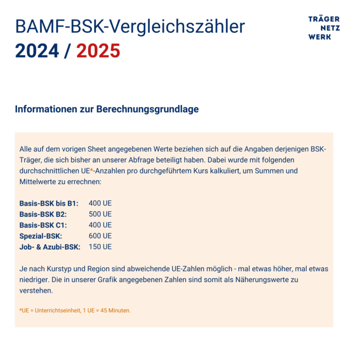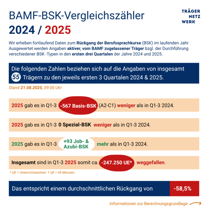 Zur Weitergabe an offizielle Stellen, z. B. Abgeordnete und Ausschüsse auf Bundesebene, haben wir im 3. Quartal 2025 Angaben von BSK-Trägern zur Kursdurchführung in den Jahren 2024 und 2025 erhoben. Es war uns ein Anliegen, den Wegfall von Berufssprachkursen so genau wie möglich zu dokumentieren. Die Ergebnisse der Umfrage, die im August 2025 endete, wurden in anonymisierter Form wie folgt festgehalten: